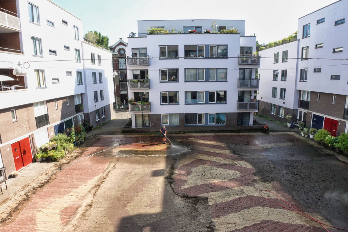 2 augustus startte de schoonmaak van de pleinen ontworpen door Sol LeWitt. De Kunstwacht nam het Koerierstersplein als eerste onderhanden met de hogedrukspuit. Het karwei is nog niet af en later...